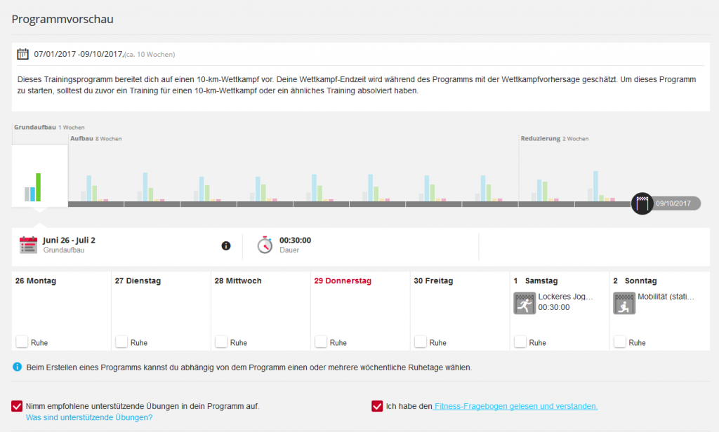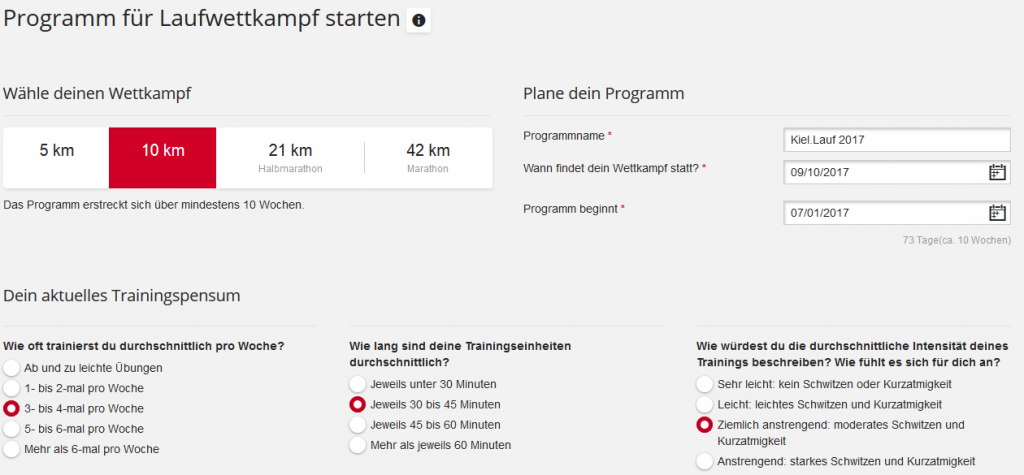 Zur Erstellung eines Traningsplans legt Ihr ein Ziel fest und beantwortet Fragen zu Eurem Trainingspensum.