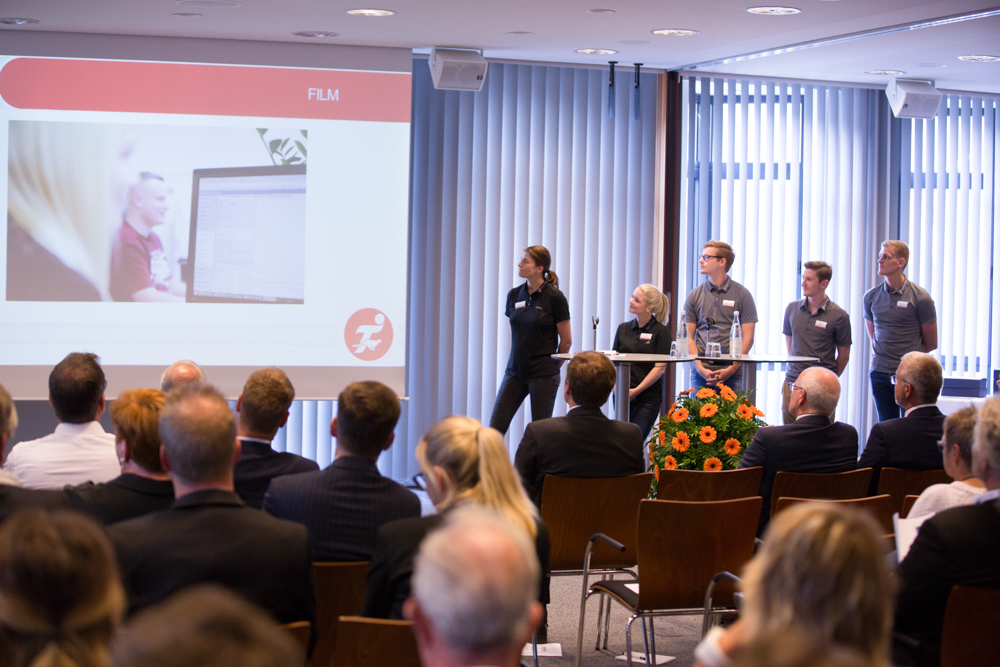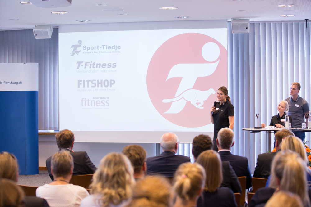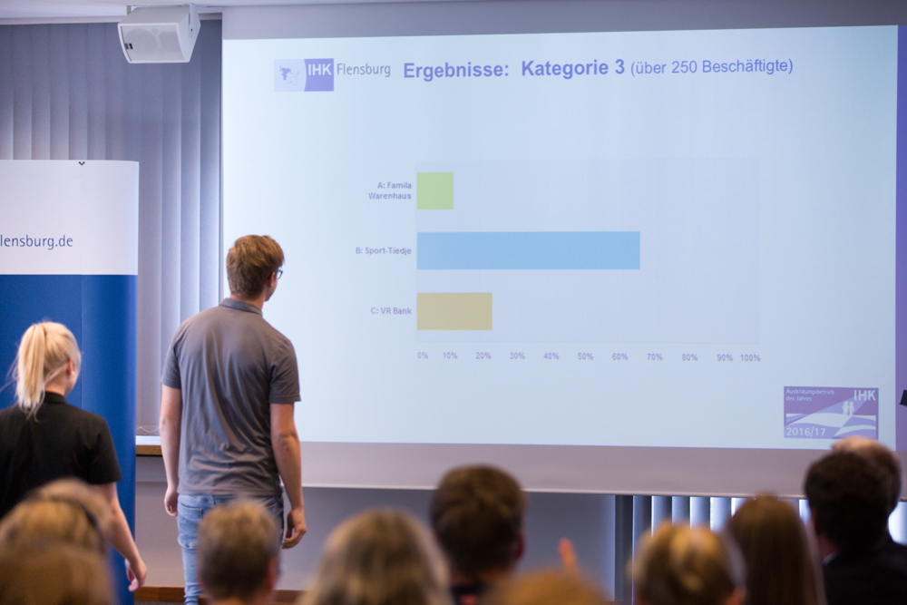 Im Anschluss an das „Get-together“ versammelten sich die Unternehmen, die Jury und alle Gäste, um die Präsentationen vorzunehmen. In drei Kategorien mit je drei Unternehmen wurden Ehrungen vorgenommen. Sport-Tiedje konkurrierte in der Kategorie der „großen“ Unternehmen, mit über 250 Mitarbeitern, mit der VR Bank eG und famila GmbH & Co. KG um den Titel. Die Präsentation und der Film fanden im Plenum vollen Anklang. Mit einer überzeugenden Mehrheit gewann Sport-Tiedje im Direkt-Voting den Titel „Ausbildungsbetrieb des Jahres“.