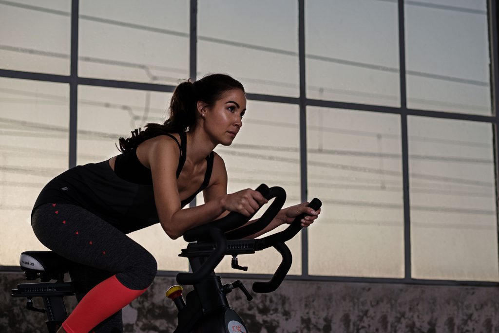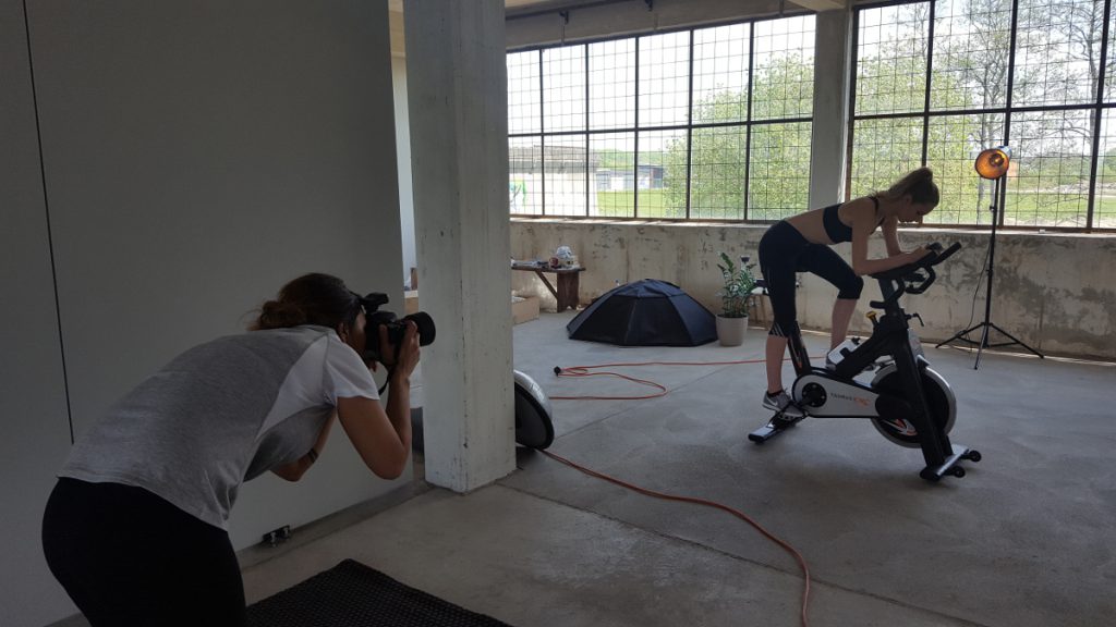 Das nächste Model jagte uns dann erst einmal einen Schock ein: Panne auf der Autobahn. Aber es ist alles gut gegangen und Katharina ist sogar noch zum Fotoshooting gekommen und das war natürlich toll für uns. Wir haben Katharina vor allem auf unser Indoor Cycle gesetzt, wo sie eine sehr gute Figur gemacht hat. Zusammen mit Joella konnten wir so sogar eine Art Rennsituation stellen: Beide gucken verbissen, Anstrengung ins Gesicht geschrieben, Körper unter Höchstspannung etc.