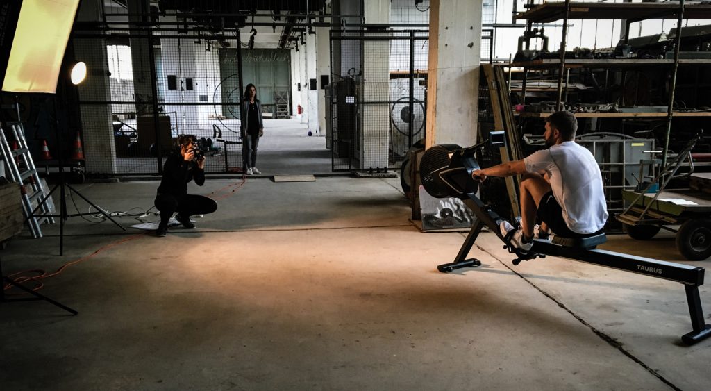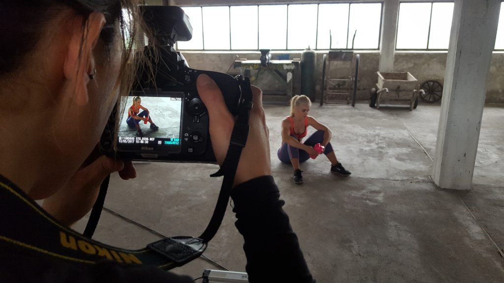 Man möchte auch meinen, dass man außer Fotografin und Model nicht viele Leute brauche. Tatsächlich waren aber erstaunlich viele Leute involviert: Die Fotografin und die Models, unsere Service-Techniker, ein Hausmeister, die Assistenz der Geschäftsführung, eine Visagistin, die Geschäftsführung, die Grafiker und mittendrin ich – unsportlichster Fitness-Blogger der Welt.