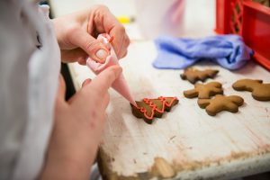 Für die Knusperhäuschen-Aktion war die Bäckerei Kalinka zu Gast, die unseren großen Besprechungsraum kurzerhand in eine kunterbunte Backstube verwandelte. Kaum trudelten die ersten kleinen Zuckerbäcker ein, wurden die Lebkuchenteile zusammengebaut und die Häuser üppig verziert.