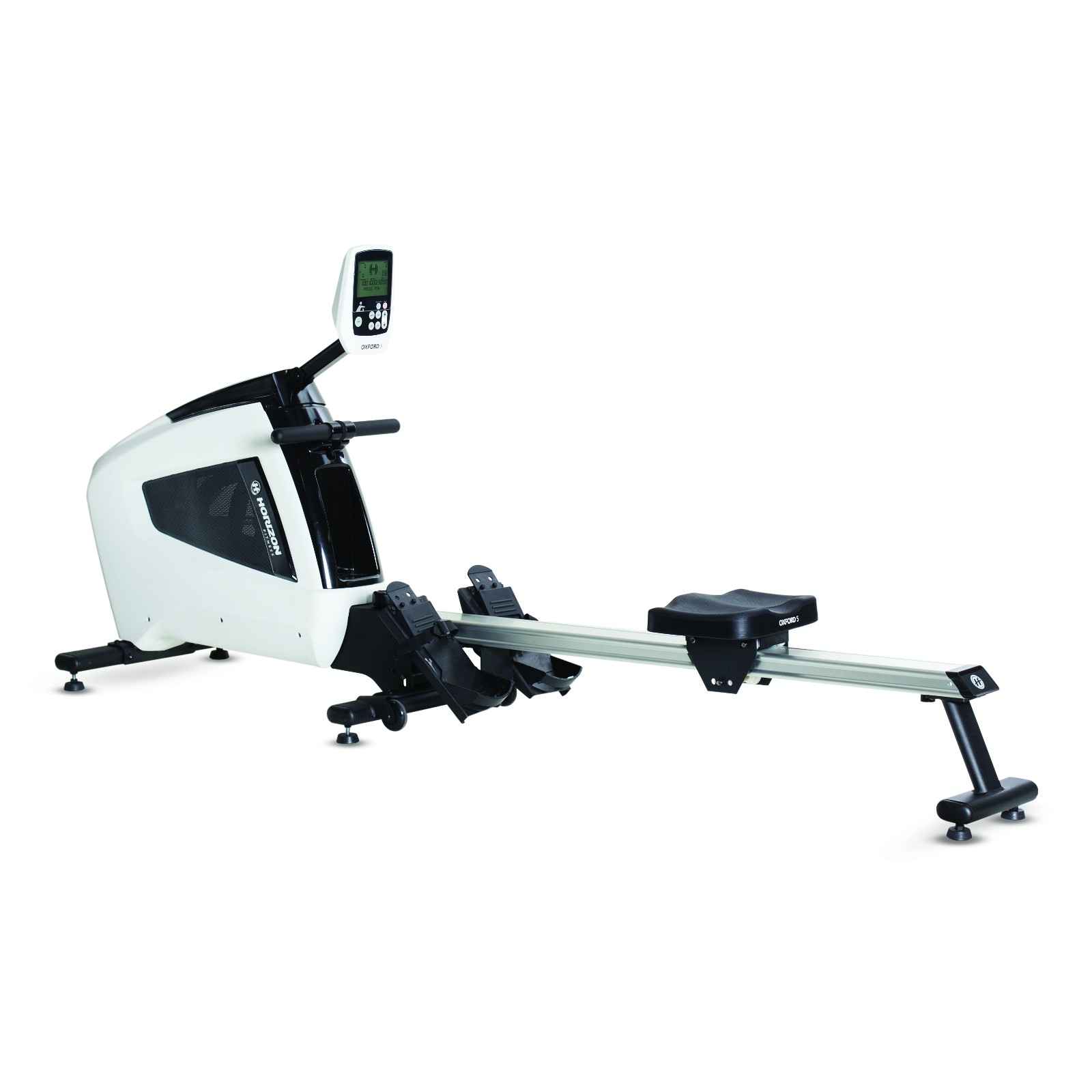 Der Trainingscomputer des Horizon Oxford 5 Rowers ist sehr einfach zu bedienen. Die wenigen Knöpfe sind sinnvoll beschriftet und auf dem großen LCD-Display werden die wichtigsten Werte übersichtlich dargestellt. Die Konsole des Horizon Rudergeräts lässt sich besonders gut erreichen, da Sie sie frei in der Höhe verstellen können. Auch den Blickwinkel können Sie stufenlos ändern.Das Horizon Fitness Rudergerät Oxford 5 hat einen großen, ergonomisch geformten Sitz, der sehr bequem ist. Er läuft sehr leicht über die Aluminiumschiene. Durch seine Höhe von 37 cm ist es besonders komfortabel beim Horizon Oxford 5 auf- und wieder abzusteigen. Die Fußstützen lassen sich einstellen und bieten mit den Schlaufen einen sicheren Halt. Nach dem Training lässt sich das Horizon Fitness Rudergerät Oxford 5 ganz einfach zusammenklappen und platzsparend verstauen.